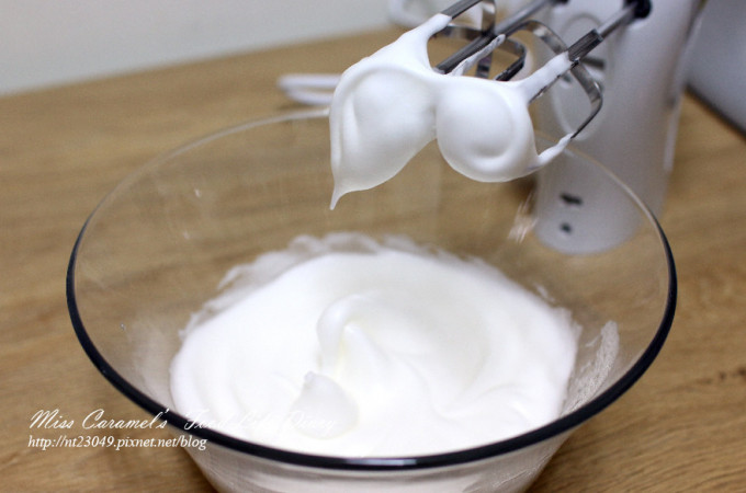 蛋白打成粗泡泡後 分兩次加入砂糖 打發至濕性發泡 因為不用膨脹太高 所以蛋白不需要打發太硬喔 就可以拌入巧克力麵糊中