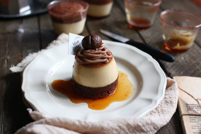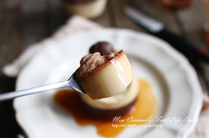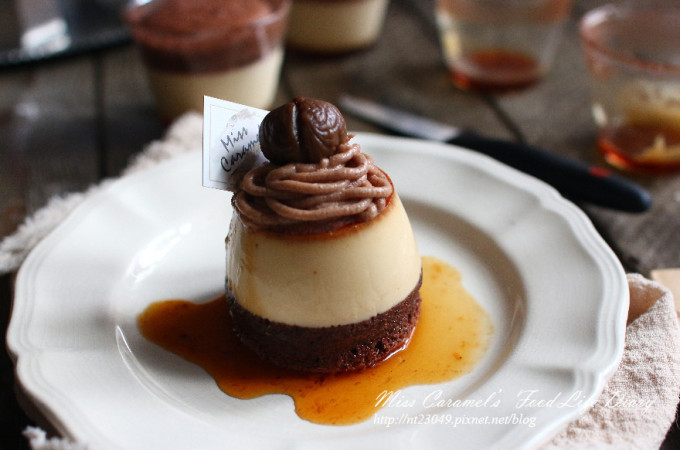 完成後裝入擠花袋 吃的時候 將布丁倒扣出來 頂部擠栗子泥 在放上一顆栗子就完成囉!!!