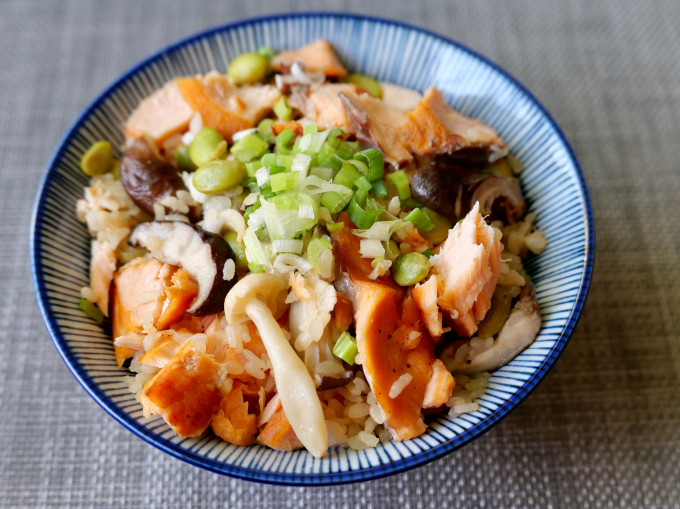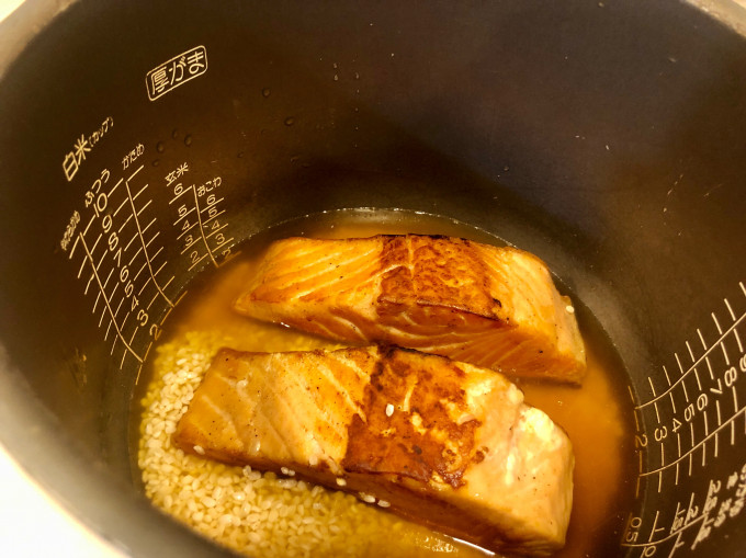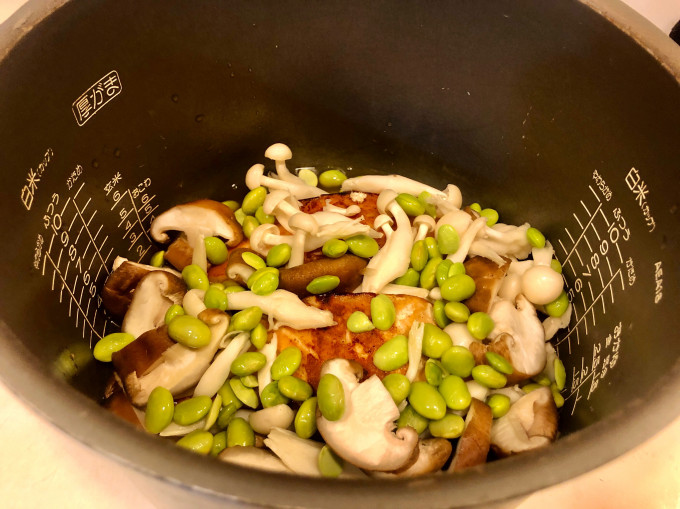 白米洗淨放入內鍋 加入備好的柴魚水及醬油 米酒 味霖拌勻