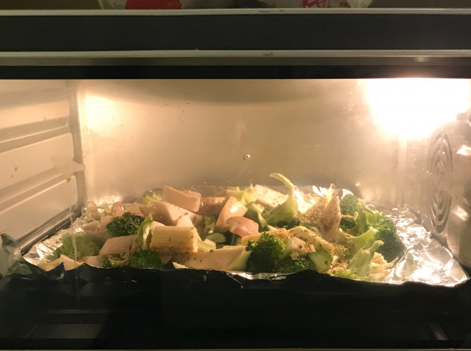 在烤盤上鋪鋁箔紙,先加一匙油,放上蒜泥。再鋪平所有蔬菜,並灑上胡椒鹽和西西里香料,並加1湯匙水一起烤。