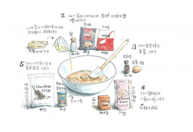 4) 加入麵粉、蘇打粉拌勻(若可能請先過篩)
