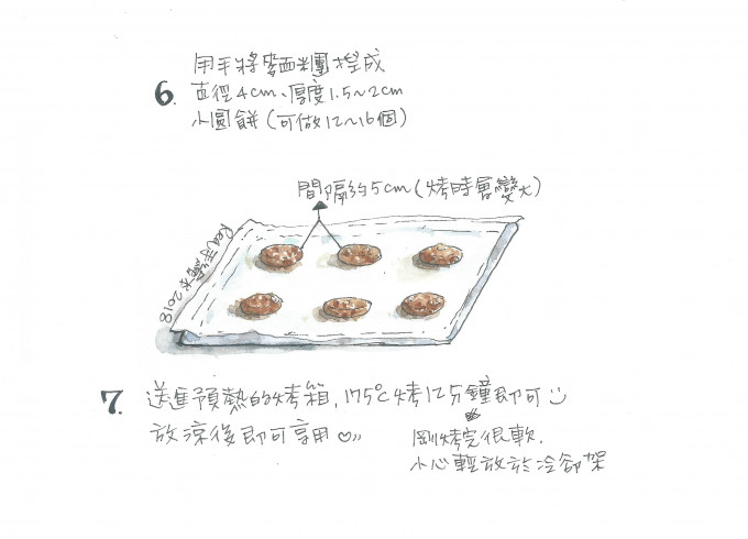 1) 用手將麵糰捏成直徑4公分、厚1.5-2公分小圓餅。