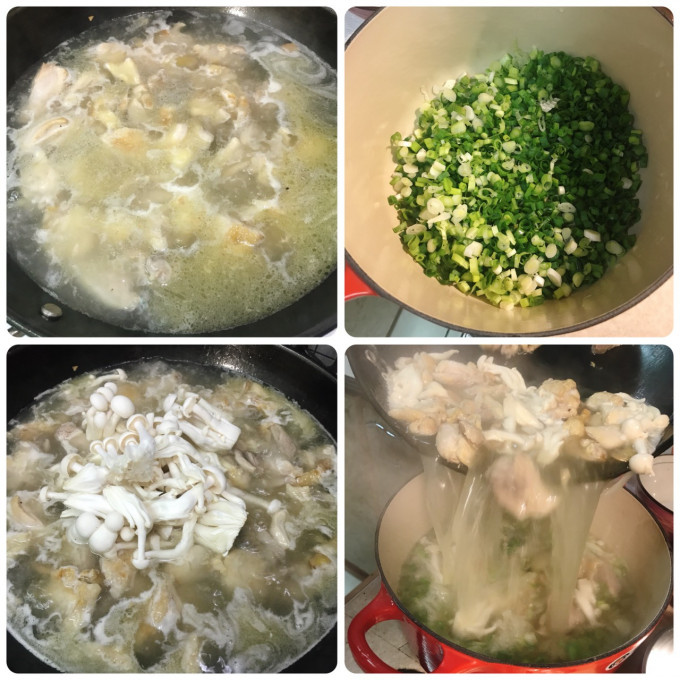 3.加入適量滾燙的熱水 4.再加入菇類煮,跟鹽巴&白胡椒調味 5.蔥花放入鍋內備用 6.將滾燙的雞湯到入蔥花內完成