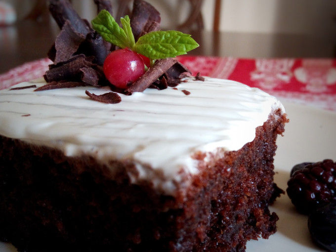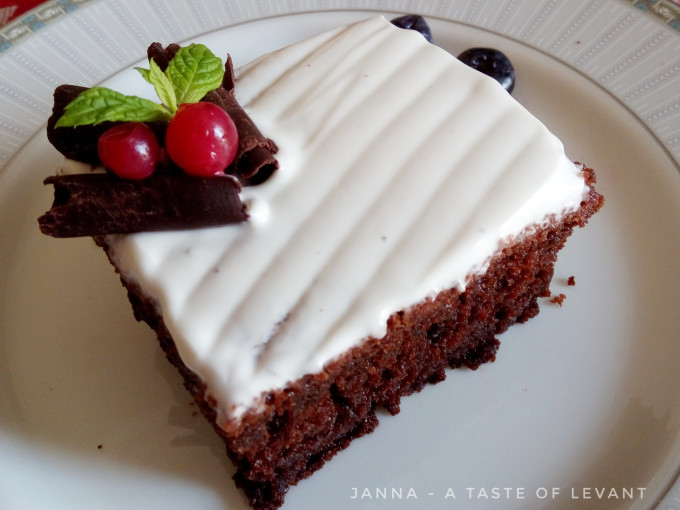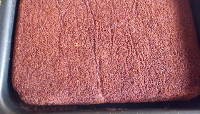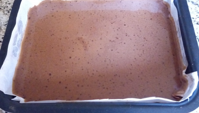 將拌好的麵糊放入墊了烤盤紙的9X13烤盤中,175度烤30-35分。因為這個蛋糕很軟且易碎,如果不用烤盤紙,則需仔細的在烤盤上抹油及撒上可可粉。