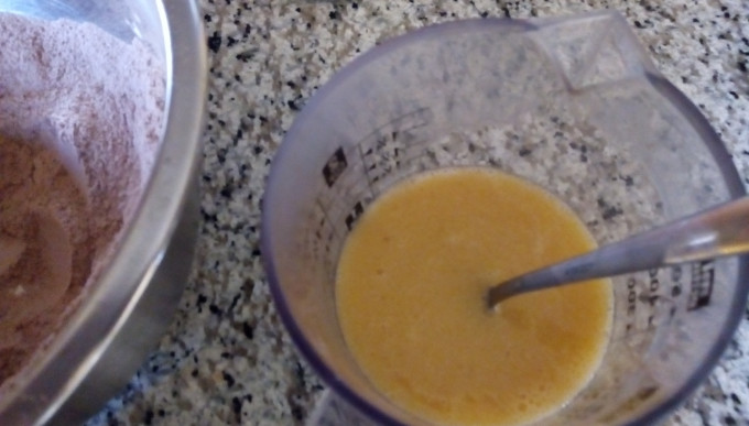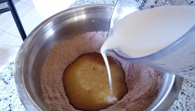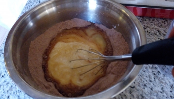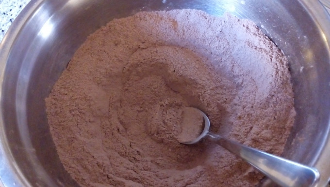 先將所有粉類,麵粉,糖,可可粉,泡打粉,蘇打粉,鹽在盆中混合均勻,確認無小結塊。泡打粉及蘇打粉如有結塊,加入前需用手指壓成粉狀,或用篩子過篩。