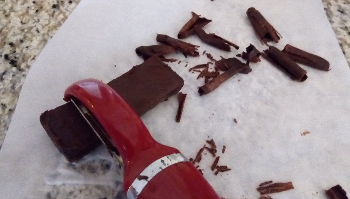 將黑巧克力塊剝成你要的寬度,微波20秒稍微軟化,這樣刨時才不易斷裂破碎,但不可融化。如果太軟,則稍等一下讓它凝固再刨。用削皮刀沿表面刨下巧克力,它會自然捲曲。