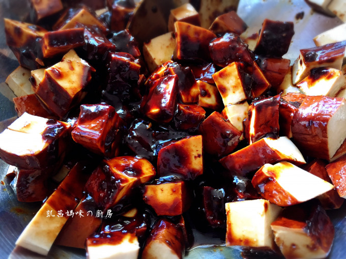 豆乾丁拌入2湯匙醬油、2湯匙甜麵醬,拌勻。