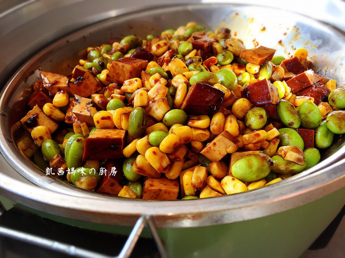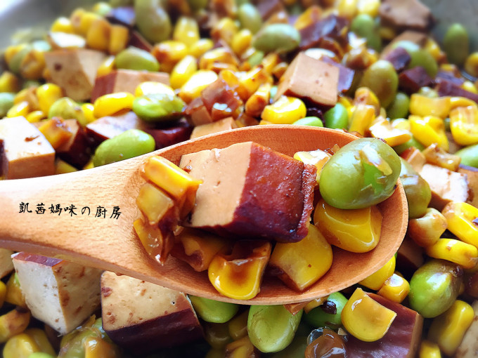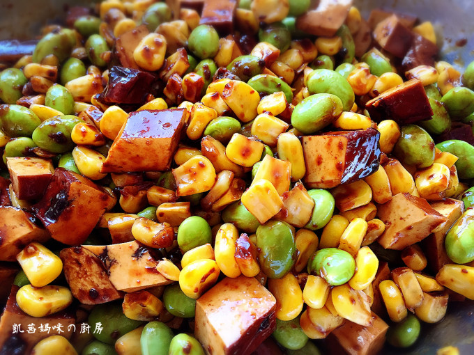 毛豆、玉米一起加入豆乾丁,與醬料拌勻;然後加入沙茶醬。