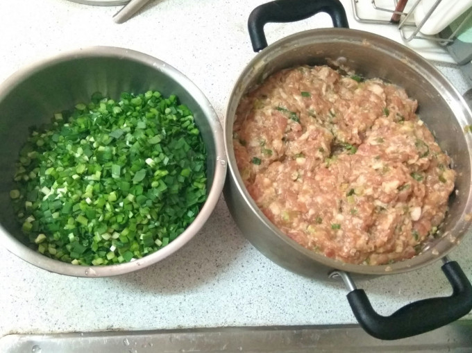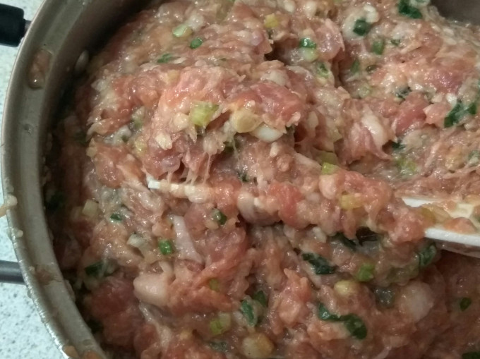 挖一點肉餡均勻攪拌,肉餡的部份分次加入,才不至於加太多