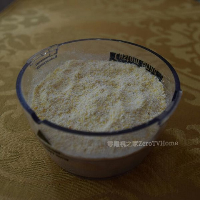 將玉米粒倒入高馬力果汁機中(例如Vitamix, Blendtec之類的果汁機),啟動機器。建議分成數次粉碎玉米粒,比較不會讓玉米粉過熱,也避免傷害馬達。