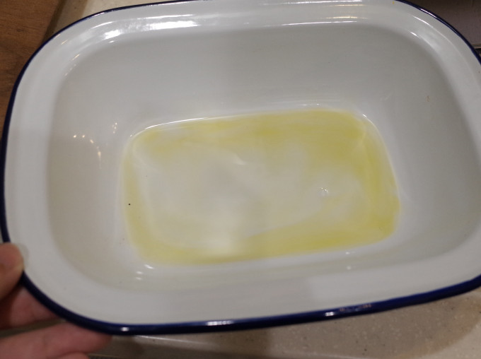 烤盤放入植物油和橄欖油放入預熱230-240度烤10分鐘