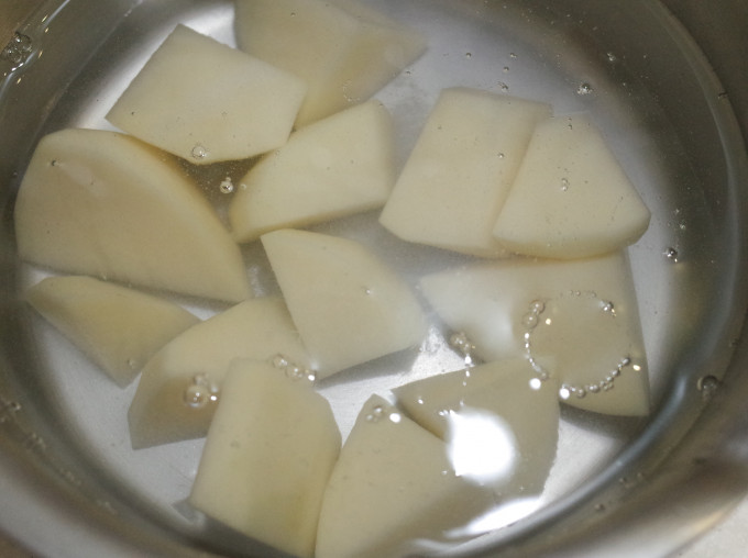 馬鈴薯去皮切大塊放入冷水中加鹽,煮至剛好熟透,牙籤可穿透馬鈴薯即可撈出瀝乾水分,接下來將馬鈴薯放入深鍋,蓋上蓋子用力搖晃鍋子把馬鈴薯撞鬆,撞鬆的邊邊角角烤完會很酥脆呢!