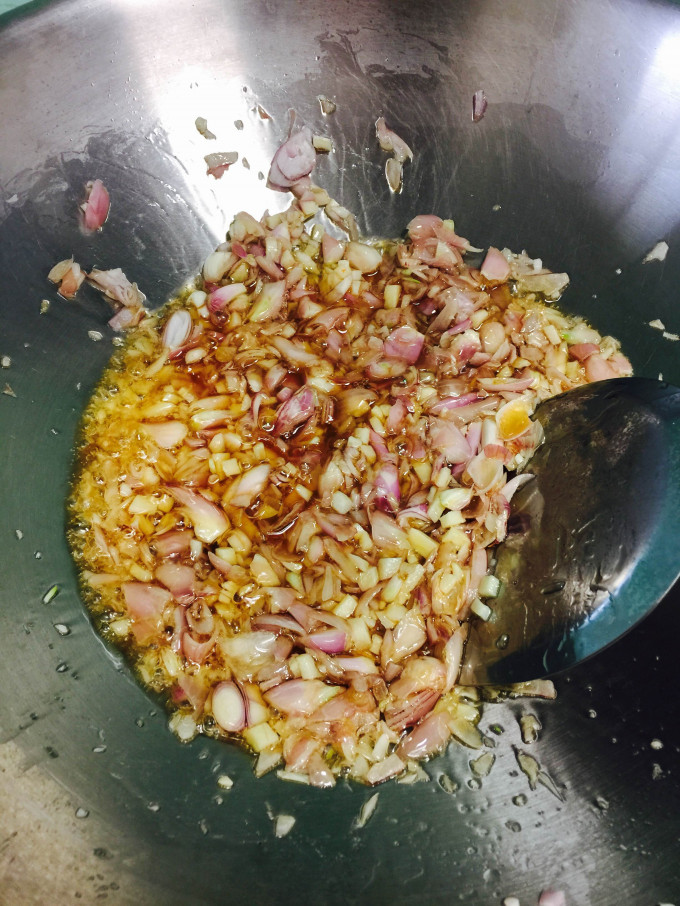 沙拉油,香油,麻油各2匙一起入鍋,油熱了把紅蔥頭+蒜頭先爆香