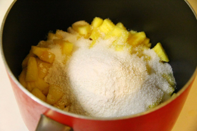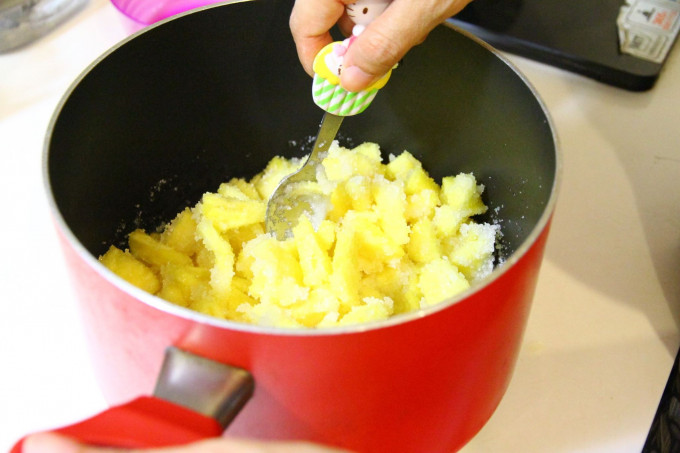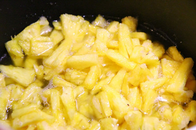 將鳳梨和糖放入鍋子 加入一小匙的香草粉(可加可不加)