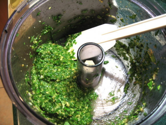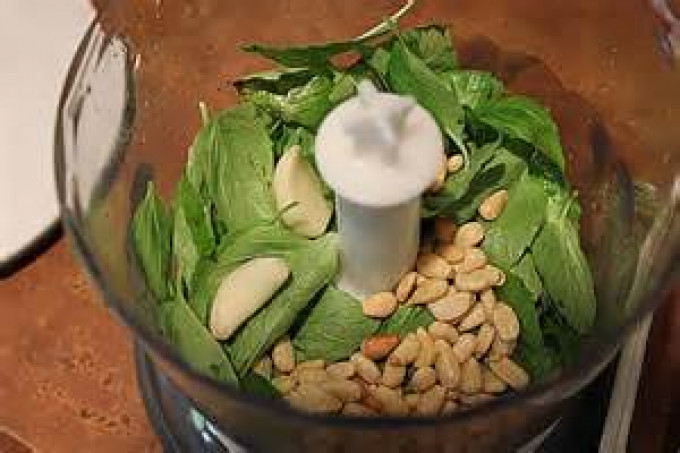 在果汁機中放入新鮮羅勒葉(若無羅勒葉,可以九層塔替代)、剛乾炒好的松子、切塊的帕馬森起士、壓碎的蒜頭,再倒入適量初榨橄欖油,全部ㄧ起打。