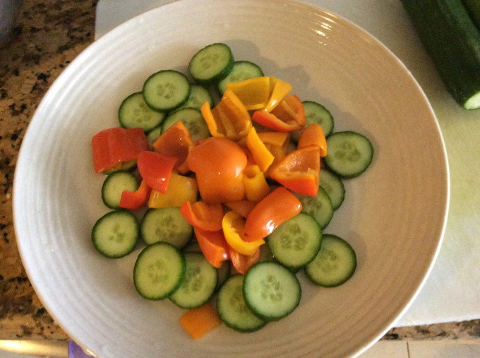 黃瓜切小圓片,先放在盤底,然後放彩椒。