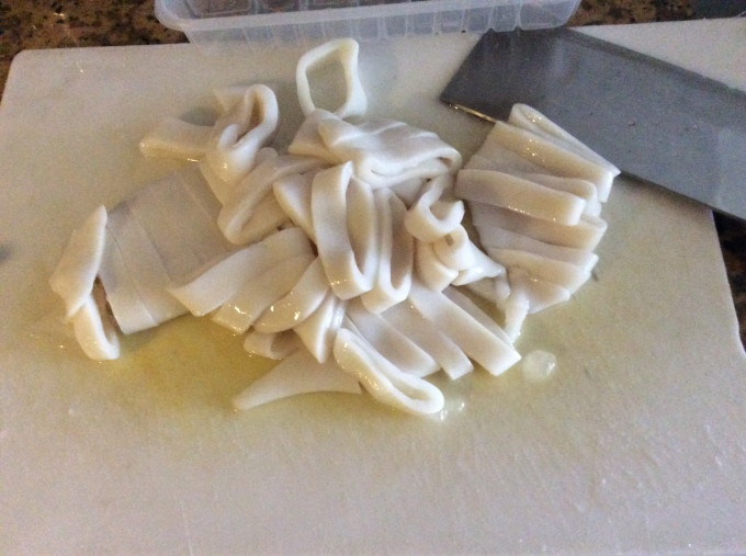 魷魚退冰後洗淨,切成環形。在滾水中川燙,不要燙太久。彩椒切小塊也在滾水中燙一分鐘,略為脫生即可。
