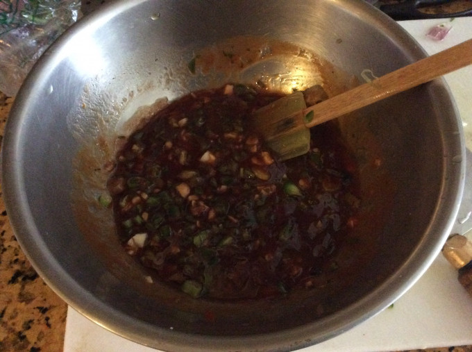 葱切成葱花,將辛香料和醬料在容器中調成五味醬。