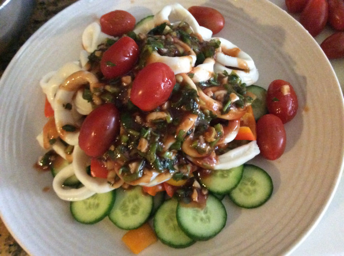 再放上魷魚圈,淋上五味醬,以小蕃茄裝點一下,簡單美味的五味鱿魚就完成囉。