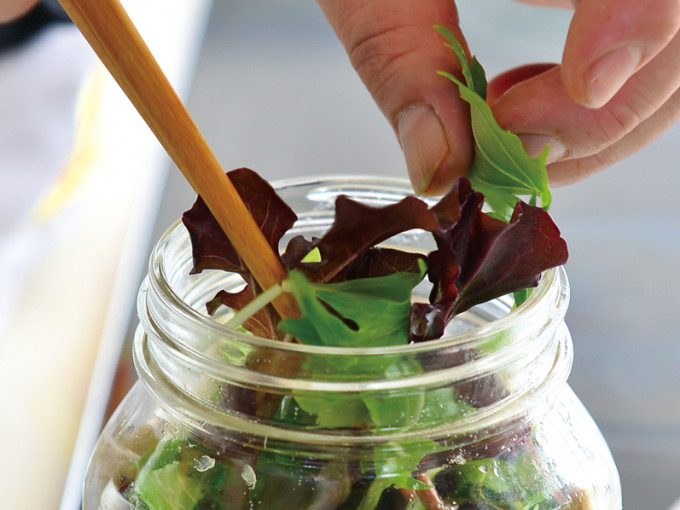 享用前將沙拉醬倒入,晃動瓶身讓醬汁與沙拉融合即可。