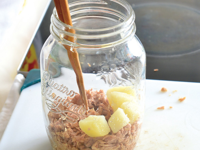 取一玻璃瓶,將鮪魚放入瓶底,依序由罐子邊緣排入馬鈴薯、小蕃茄、小黃瓜、蘑菇及綜合生菜。