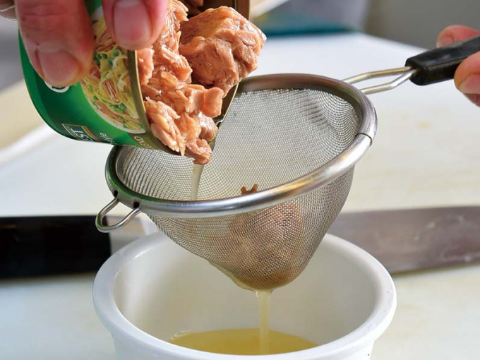 將鮪魚的油份瀝乾;小黃瓜洗淨切圓片備用。