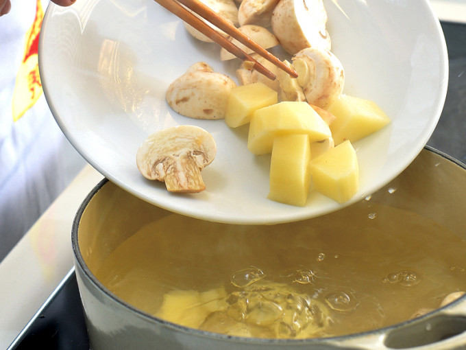馬鈴薯去皮後與蘑菇一同切小塊,再以煮滾的鹽水燙熟備用。