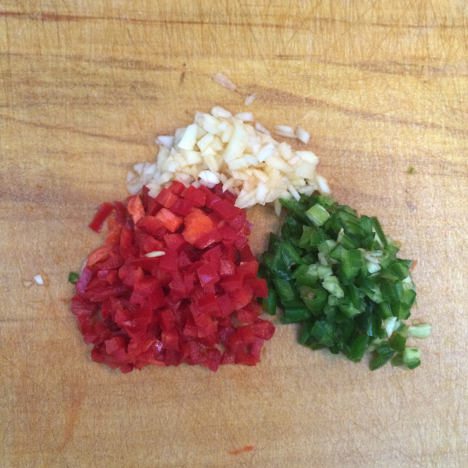將去籽紅、綠辣椒及蒜頭切碎備用。 (愛吃辣者可不必去籽)