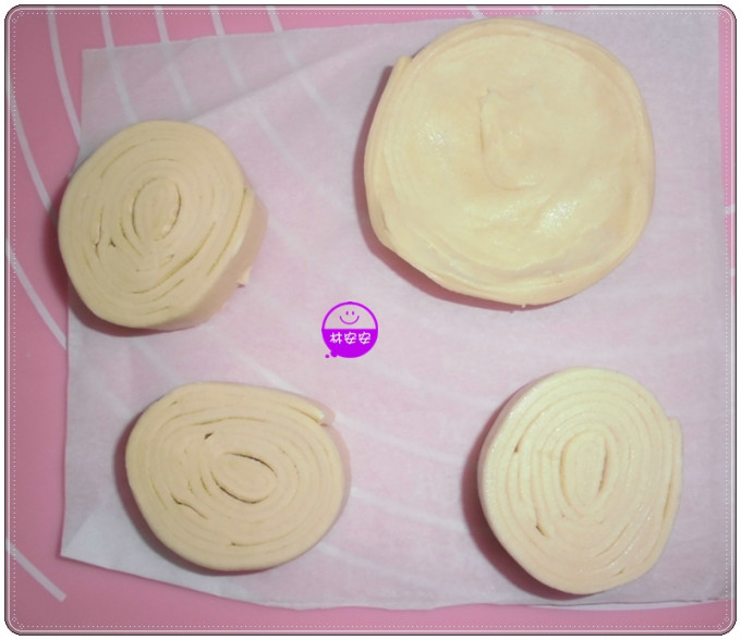 把切好的每一小段起酥片,由圓中心向圓周外側方向剝開,右上那個是剝好的,其它3片是還沒剝開的。(貼心小叮嚀:新手千萬不要偷懶省略此步驟,不然你烤出來的塔皮就無法像安安烤的一樣,一圈圈層次美美的。)