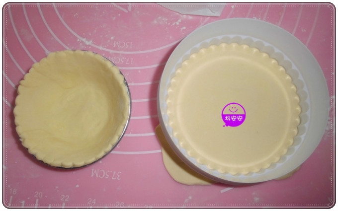 將塔皮鋪在蛋塔模具裡(安安使用SN6065)。杯底請盡量貼平,四周也盡可能不要有皺褶。