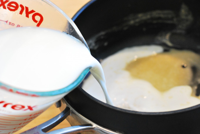 逐量加入熱鮮奶,以木湯匙攪拌至醬汁濃稠