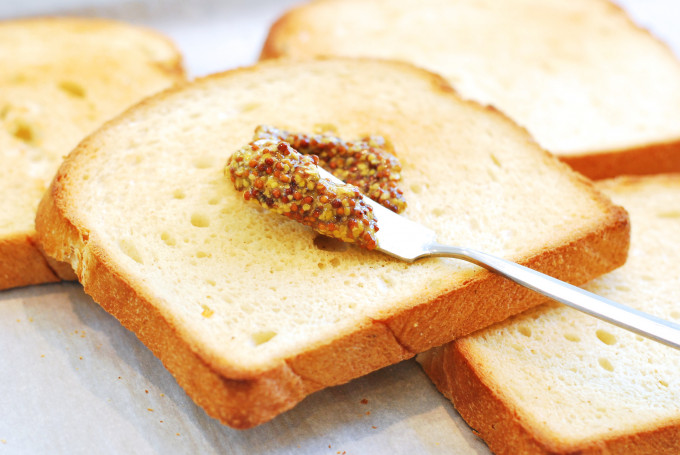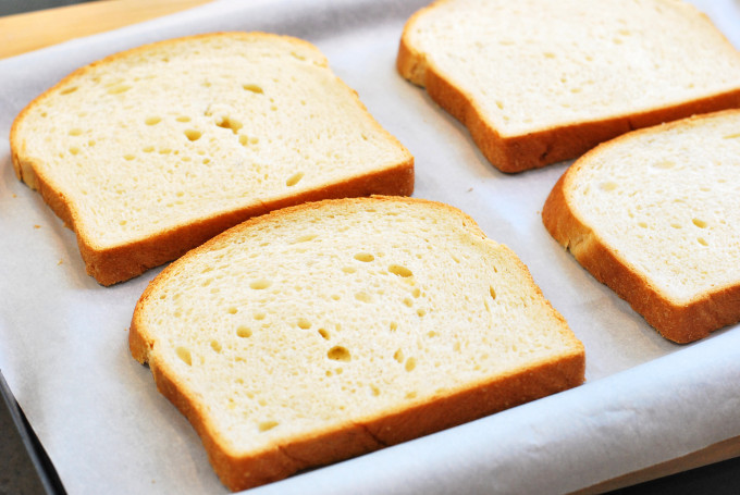 製作:將吐司麵包於400℉/200℃烤箱裡一面烤約3分鐘至酥脆上色