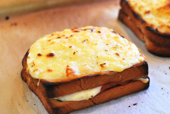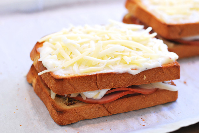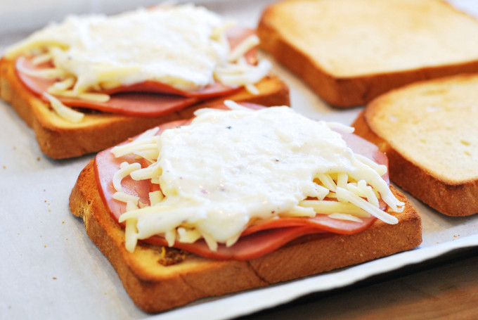 各自覆蓋上另一片麵包,淋上少許白醬,撒上葛瑞爾起司