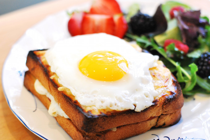 將太陽蛋鋪上三明治,撒上適量海鹽,佐沙拉或水果,趁熱享用