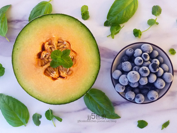 哈密瓜跟藍莓,恰巧與羅勒和薄荷都是好朋友,紅酒醋把大家聚在一起,冰冰吃很解熱!
