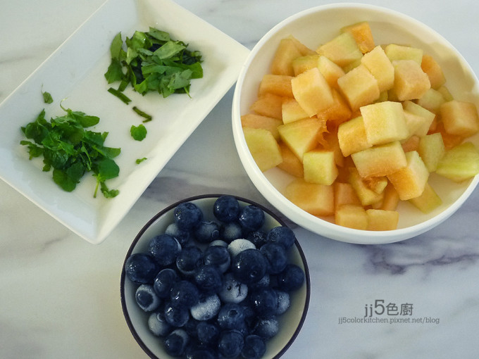 哈密瓜去籽,羅勒及薄荷葉洗淨。