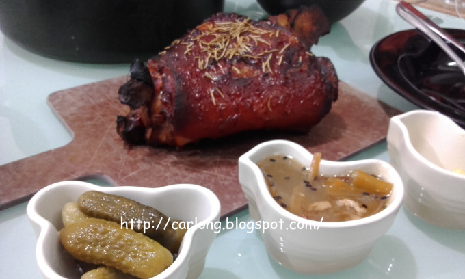 半小時 , 取出德國鹹豬手放在夜涼架吹乾 , 風乾表面之後用簽拮德國鹹豬手豬皮表面 , 噴薄薄欖油 , 灑上香草 , 海鹽 , 放入焗爐 160-180'C 20 -25 分鐘 , 皮脆即可 .