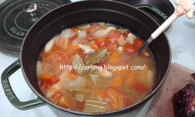 洋蔥 , 甘荀 , 西芹 , 椰菜 , 粟米仔 , 蕃茄 ( 多蕃茄會好味 D , 我今次用 2 磅蕃茄 + 一盒車厘茄 ) bay leaf 月桂葉 , 欖油少許 , 德國鹹豬手飛水沖冰水 , 用廚房紙印乾 , 薑片 , 放入鑄鐵鍋大火煮滾 , 轉細火 140'C - 1 小時 , 唔開蓋燜多