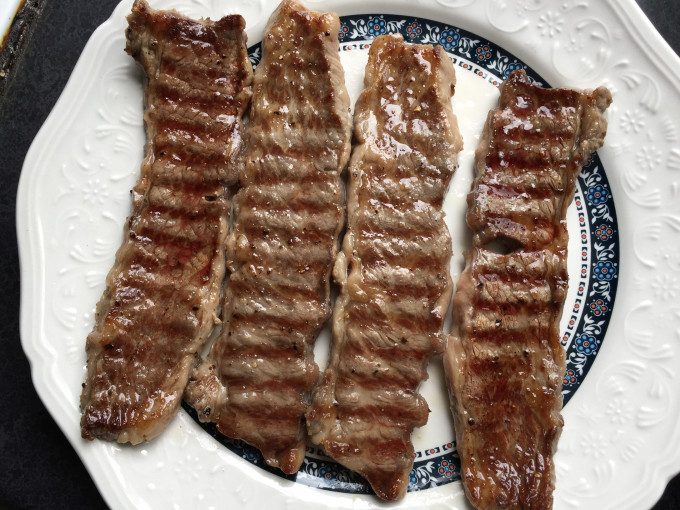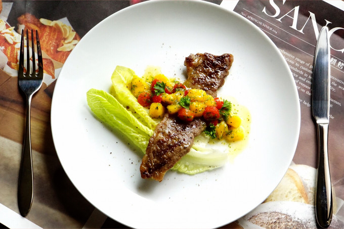 將牛小排盛盤,淋上芒果莎莎醬,再刨些檸檬皮絲就完成了!