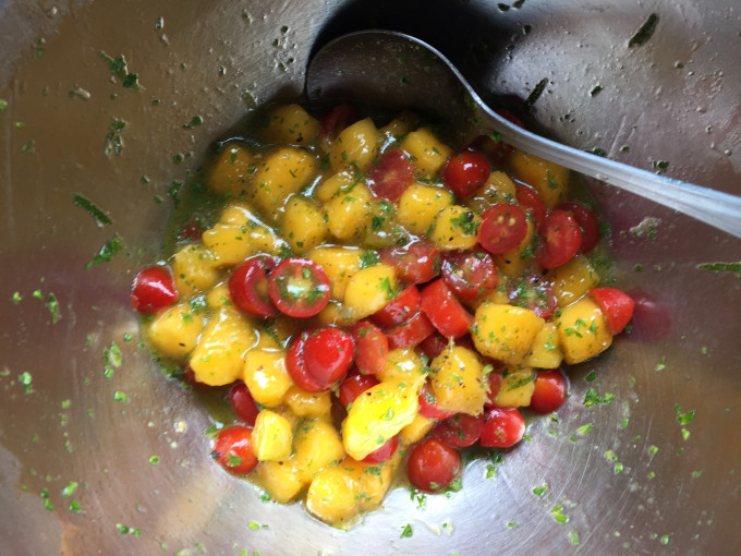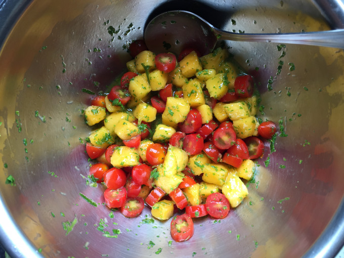 芒果及小番茄切成適當小丁的大小,加入檸檬汁,巴西里末拌勻放冰箱冷藏