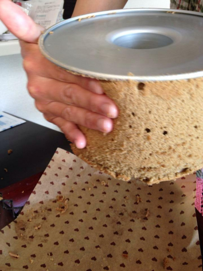 一定要是倒扣放涼約3小時以上的蛋糕。烤好時很膨,但是放涼後自然會向內縮一點。用手掌往邊緣處向下壓約4到5公分,邊轉邊壓。