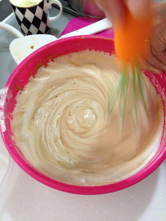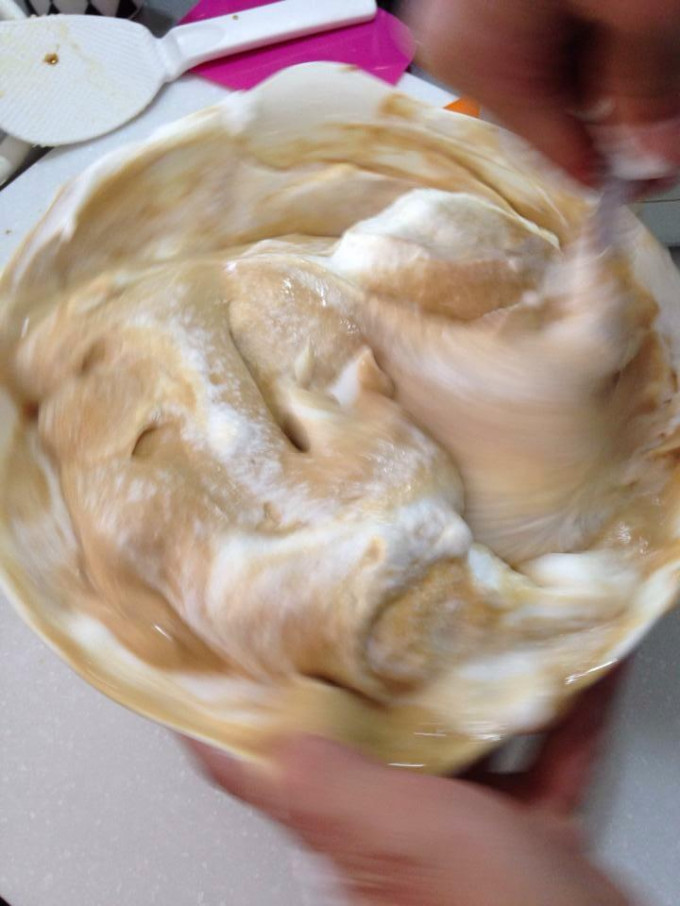 最後把攪拌好的咖啡蛋黃糊全部倒到蛋白霜的盆子,然後換成刮刀,用底向上,轉著盆子,均勻拌開,一直到看不到蛋白,動作要輕快,以免消泡。