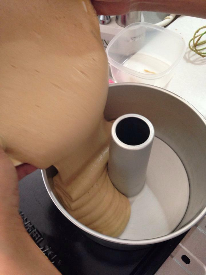 從低處倒下入烤模,拿筷子叉入麵糊中繞幾圈之後,手拿著烤模向台上敲一敲,把空氣敲出來。