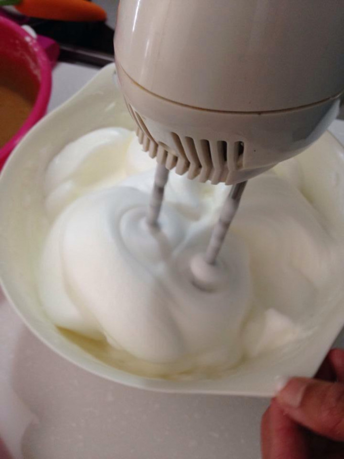先放3分之1的蛋白霜至蛋黃糊中,用手動攪拌器充分拌勻至看不到蛋白,再加入3分之1蛋白霜進入蛋黃糊中,在表面一直用劃圈的方式攪拌