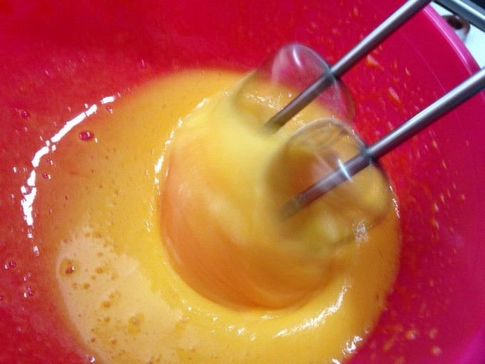 蛋黃打散後,慢慢加入砂糖A,然後打至如美奶滋的狀態。然後加入香草精混合。