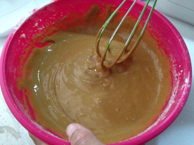 加入咖啡液混合,再慢慢倒入沙拉油混合,篩入粉類,改用手動攪拌器充分混合,成咖啡蛋黃麵糊。