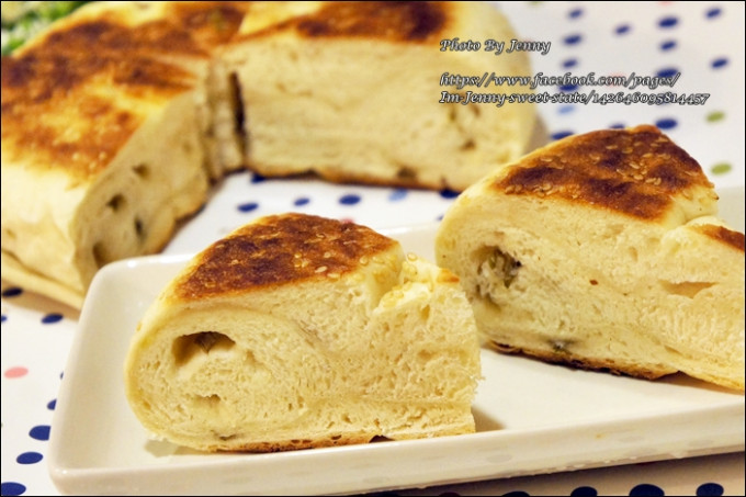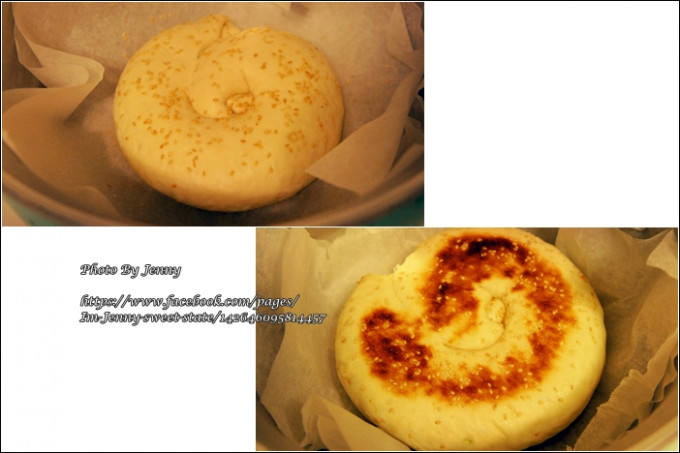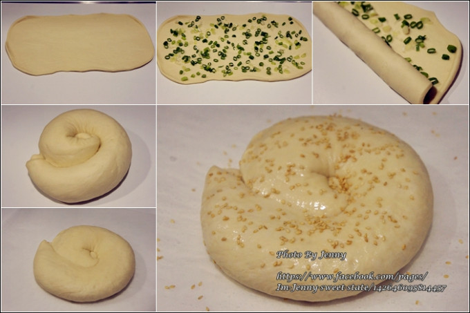 鬆弛的麵糰若沾黏,可於表面灑些手粉避免沾粘,用桿麵棍桿成一個長方形,撒上蔥花捲起呈長條狀後盤成圓形再略桿扁些放入電鍋中(約3公分厚度),麵糰噴些水撒上芝麻第二次發酵30分鐘。(放入電鍋前底層平鋪烘焙紙,不能插電喔!)