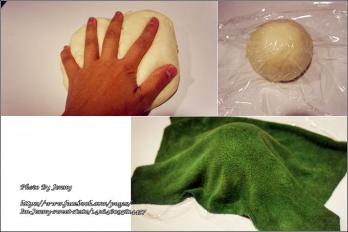 麵糰中的空氣用手壓下去擠出來後滾圓,鋪上一層保鮮膜以防乾燥,再蓋上擰乾的濕布鬆弛10分鐘。