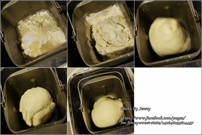 材料全部放進麵包機(Zojirushi BB-HB10),基本發酵時程1小時45分鐘 (含攪拌) 麵糰變二倍大即可。