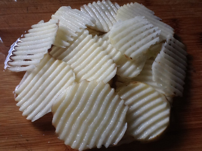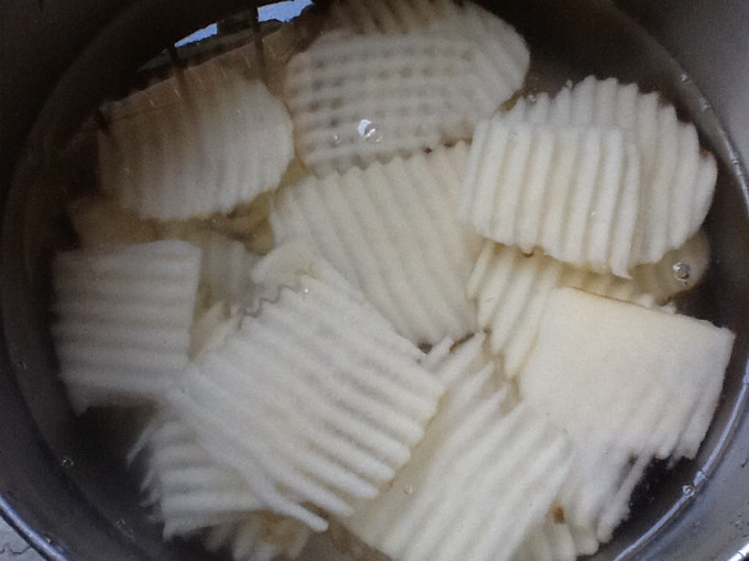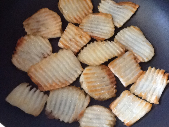 起鍋,開最小火,倒入少許食用油,放入薯片,適時的翻面,煎至熟透兩面呈金黃色(約10-12分鐘)即可起鍋。(即為原味薯片)